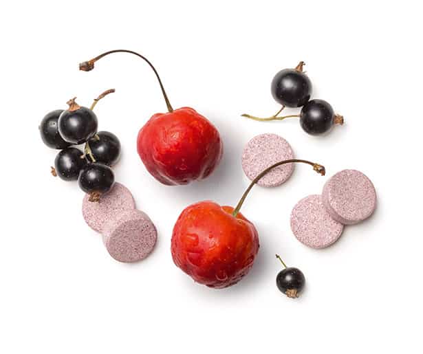 Acerola yra atogrąžų uogos, auginamos Puerto Rike ir Floridoje. 1 kramtomojoje tabletėje yra 25 % tropinių vyšnių ir 10 % juodųjų serbentų.