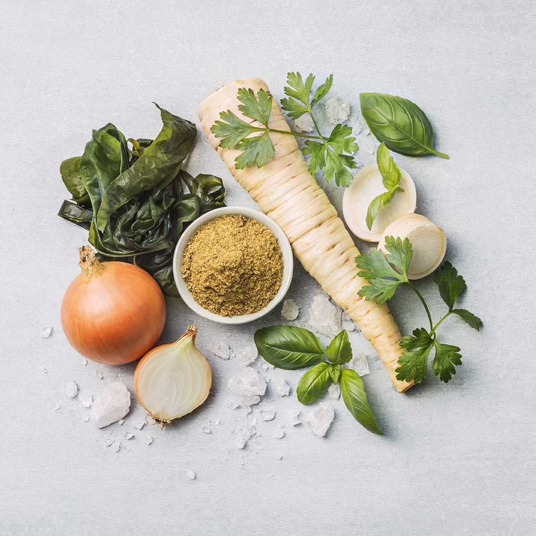 Jūros druska kartu su svogūnais, bazilikais, petražolėmis, mairūnais, rozmarinais, porais ir jūros dumbliais sukuria unikalų skonį.