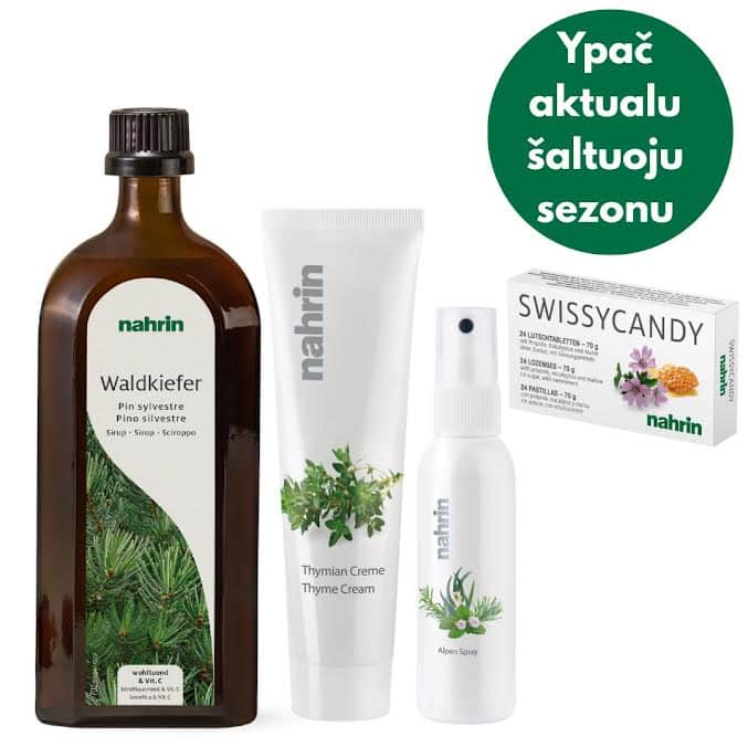 Rinkinys kvėpavimo takams, gerklei: pušų ūglių sirupas su medumi, čiobrelių kremas, Alpių aliejų purškiklis ir kietosios pastilės